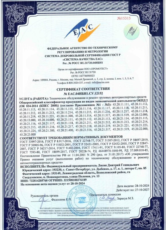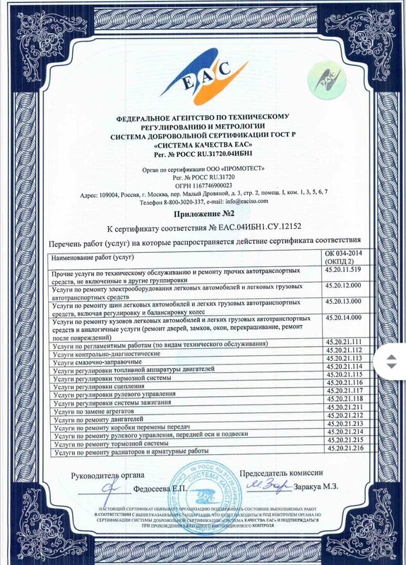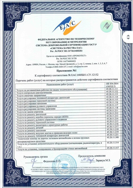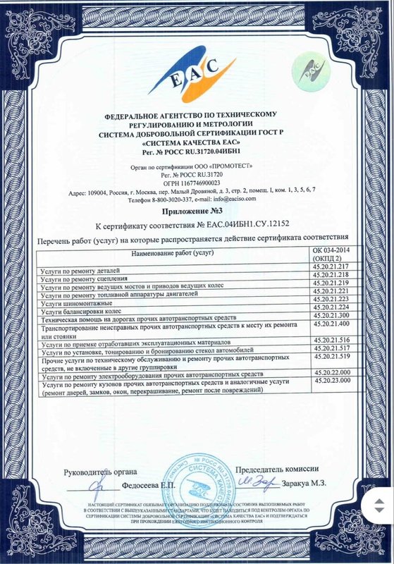 Компания располагает штатом опытных автотехников: у нас выполняют замену масла, заправку кондиционеров, кузовной ремонт, ремонт выхлопных систем, двигателей (в том числе дизельных), карбюраторов, подвески и электрооборудования, сход-развал, тюнинг (в том числе двигателей), шумоизоляцию салона, шиномонтаж. На услуги мастерской дается гарантия, срок которой может зависеть от типа работ и использованных материалов.